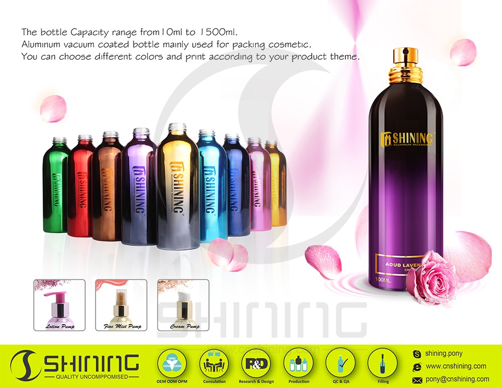 Bottle is made of pure aluminum, Shatterproof and 100% recyclable, these bottles are lighter than glass and more durable than plastic. Choose with a lined cap, sprayer, or pump, all included in the bottle price. There are SGS & LFGB approved and surface finished with 1-9 color offset printing,