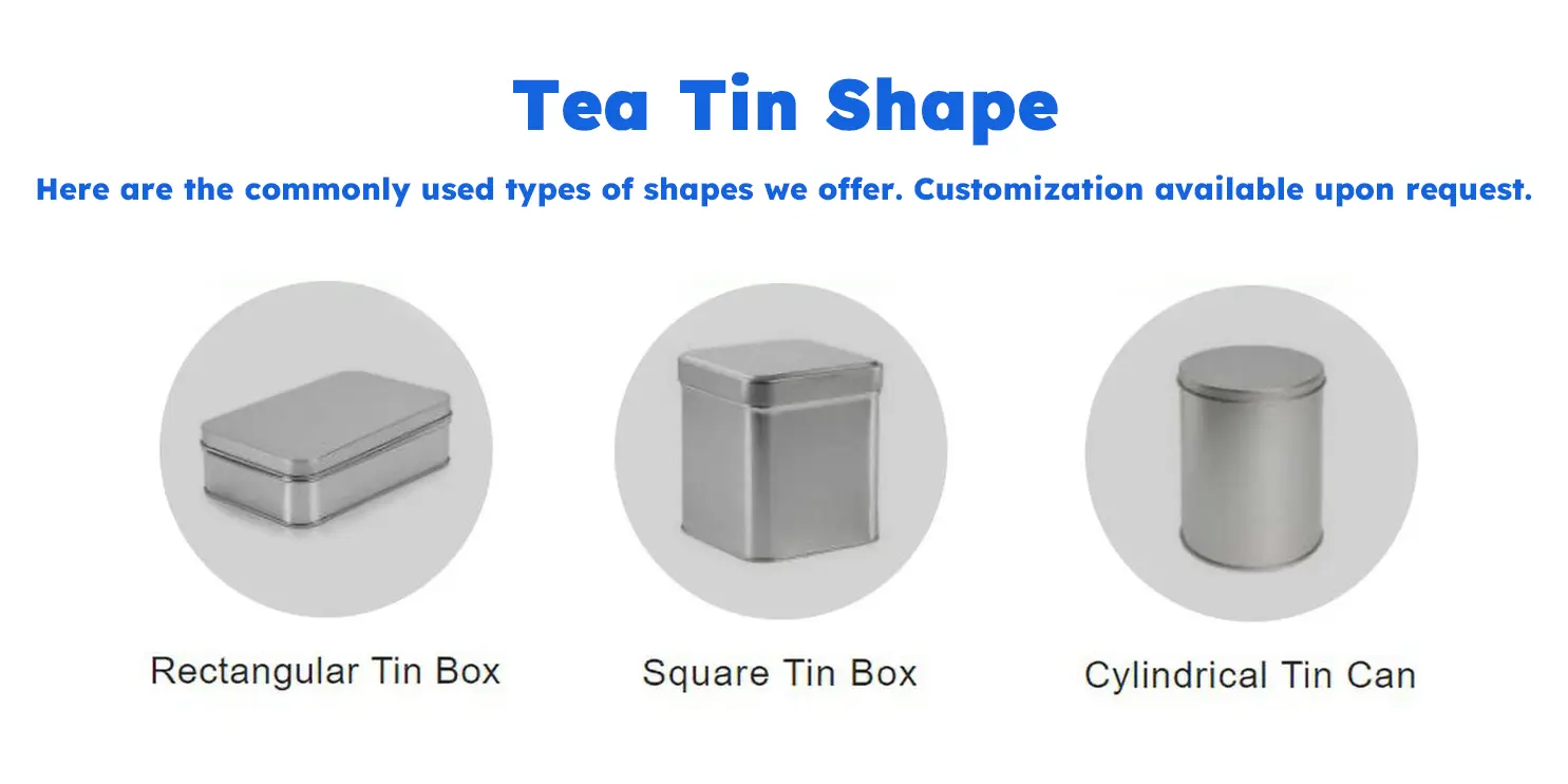 تتوفر علب الشاي لدينا بأشكال دائرية ومربعة ومستطيلة لتناسب أي منتج أو علامة تجارية. نقدم علبًا صغيرة الحجم مناسبة للسفر، وعلبًا كبيرة السعة (يتراوح ارتفاعها عادةً من 8 سم إلى 18 سم)، ويمكن تعديل جميع الأبعاد حسب احتياجاتكم. توفر العلب المربعة والمستطيلة استخدامًا فعالًا لمساحة الرفوف (يمكن تصنيع جدرانها رقيقة ولكنها متينة بفضل استخدام صفيحة معدنية بسماكة 0.23 مم).
