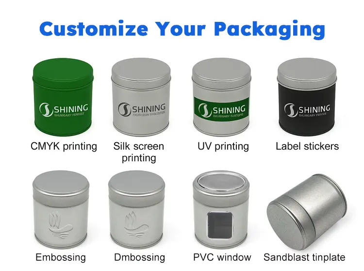 تقدم Shining Packaging خدمة تخصيص كاملة للرسومات والتشطيبات لتمييز علامتك التجارية. يمكننا طباعة التصاميم بألوان CMYK الكاملة (طباعة أوفست) أو بألوان محددة، بالإضافة إلى استخدام الطباعة بالشاشة الحريرية أو الطباعة الرقمية للحالات الخاصة. كما نوفر خدمة النقش البارز أو الغائر لإضافة شعارات أو أنماط ثلاثية الأبعاد بارزة الملمس. بعد الطباعة، نطبق طبقات واقية من الورنيش أو الطلاء بلمسة نهائية لامعة أو مطفية أو ساتانية حسب اختيارك (حتى الورنيشات ذات الملمس الخشن مثل الورنيش المتشقق أو المطاطي ذي الملمس "الحصوي"). ولإضفاء لمسات مميزة، يمكن استخدام ختم الرقائق المعدنية أو الختم الساخن لإبراز الشعارات أو عناصر التصميم. كما نوفر طلاء UV موضعي لجعل مناطق معينة لامعة وجذابة. تضمن هذه الخيارات أن تكون كل علبة معدنية ليست واقية فحسب، بل جذابة بصريًا أيضًا على الرف.