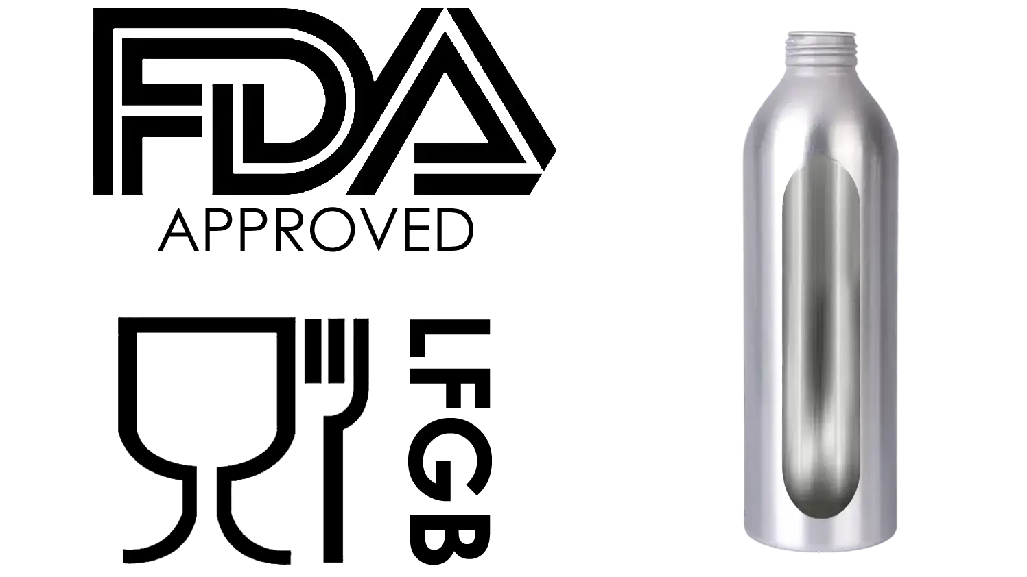 Unsere Flaschen sind innen mit einer transparenten, lebensmittelechten Beschichtung versehen und erfüllen die Sicherheitsstandards der US-amerikanischen FDA und des europäischen LFGB.