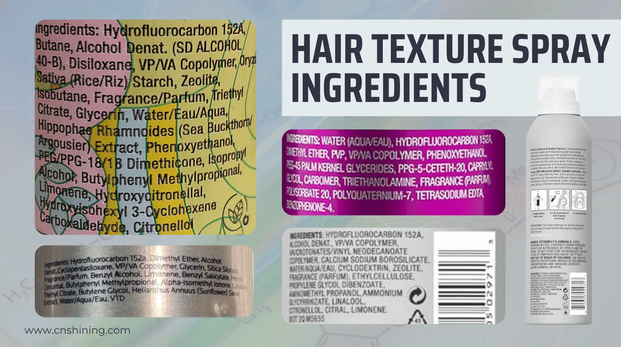 많은 헤어 텍스처 스프레이의 주성분은 다음과 같습니다. 수소불화탄소 152A, 이는 추진제 역할을 하여 제품을 고르게 분산시키는 데 도움을 줍니다. 이는 종종 다음과 함께 사용됩니다. 디메틸 에테르 그리고 부탄, 또한, 이는 미세한 안개 분사를 보장하는 추진제 역할도 합니다. 변성알코올(SD Alcohol 40-B) 이 제품은 모발을 빨리 말리는 특성 덕분에 자주 사용되며, 모발을 젖거나 끈적거리지 않게 유지하면서 즉각적인 스타일링을 도와줍니다.