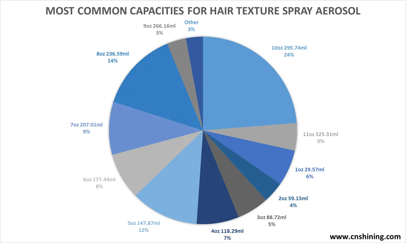 아마존에서 판매되는 헤어 텍스처 스프레이 에어로졸 제품의 용량 분포를 살펴보면, 크기에 상당한 차이가 있음을 알 수 있습니다. 가장 흔한 용량은 10온스(295.74ml)로, 전체 제품의 21.73%를 차지합니다. 그 다음으로는 8온스(236.59ml) 용기가 12.71%, 5온스(147.87ml) 용기가 10.70%를 차지합니다. 제품 크기의 다양성은 소비자의 다양한 요구와 선호도를 반영합니다.