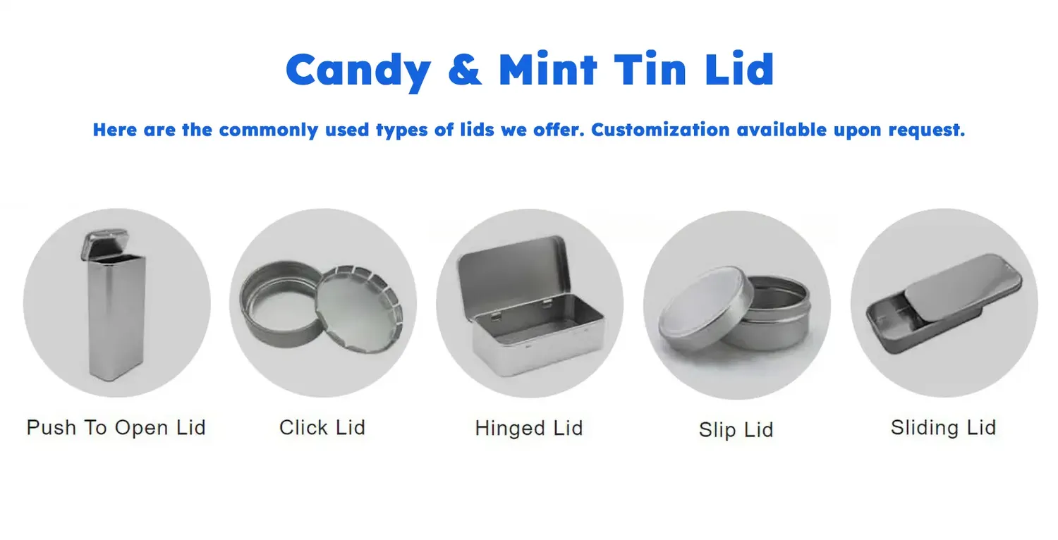 Options include push to open, click, hinged, slip, and sliding lids for easy access and freshness. Child-resistant features are available for cannabis or supplement tins.