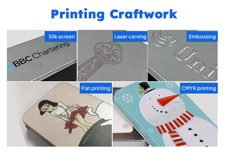 Shining Packaging offers full custom printing on all tin exteriors. We support CMYK offset printing and Pantone spot colors, including special metallic inks and effects. Finishes can be glossy, matte or other specialty coatings (e.g. UV-curable varnish). Logos and graphics may be enhanced with embossing or debossing: tooling is made for 2D or 3D embossed patterns. In short, virtually any color or finish – from glossy metallic to soft-touch matte – can be applied to match a brand’s style.
