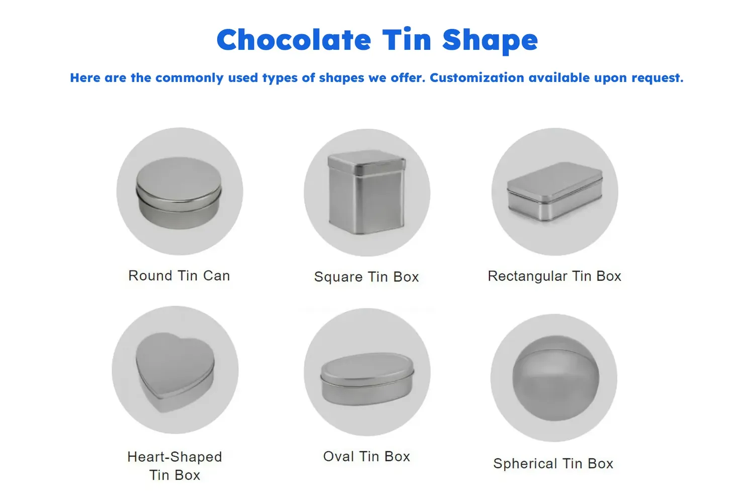 Our chocolate tins come in a wide range of sizes and forms. Heights can vary roughly from 23 mm up to 130 mm to suit everything from single bonbons to large gift assortments. We offer virtually any shape you can imagine – round, square, rectangular, heart, oval, spherical, and more – all fully customizable to match a brand’s identity or a holiday theme. Whether you need a slim oval tin for Easter eggs or a unique geometric tin for a special promotion, Shining Packaging can tailor the dimensions and shape to your exact specifications.