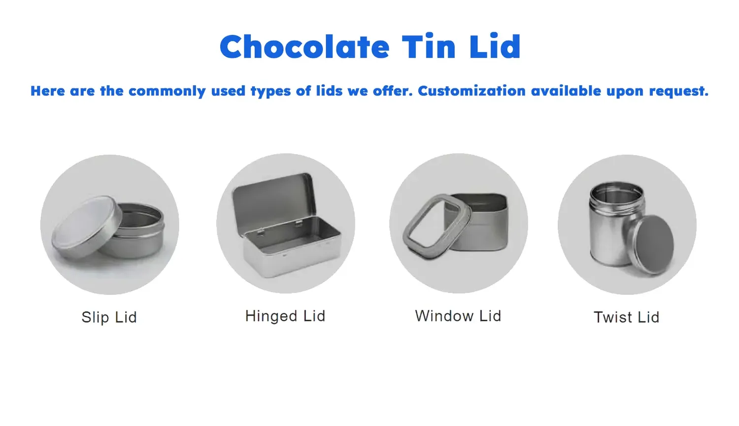 Multiple lid styles are available to enhance both function and presentation. Options include standard solid (slip-on) lids, hinged flip-top lids, clear window lids, and threaded screw-top lids. Hinged lids allow convenient one-hand opening, while window lids let consumers see the chocolates inside without opening the tin. Screw-top lids (and snap-fit lids) provide an airtight, tamper-evident seal. This variety of closures ensures the tin stays securely closed during shipping, while making the unboxing experience both easy and engaging.