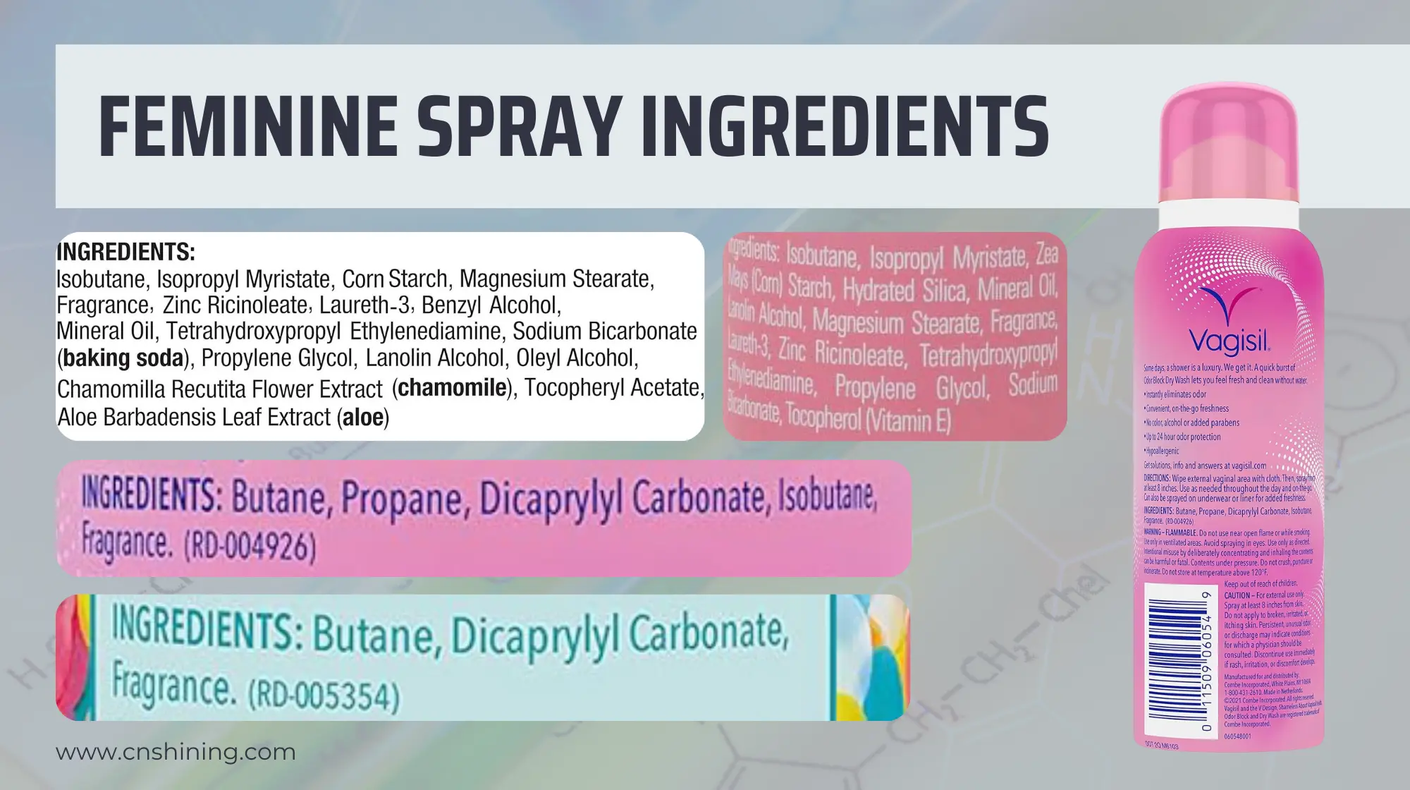 Pesquisamos diversos produtos aerossóis íntimos mais vendidos na Amazon e identificamos os seguintes ingredientes-chave em comum. Esses ingredientes foram cuidadosamente selecionados para garantir eficácia, segurança e conforto da usuária.