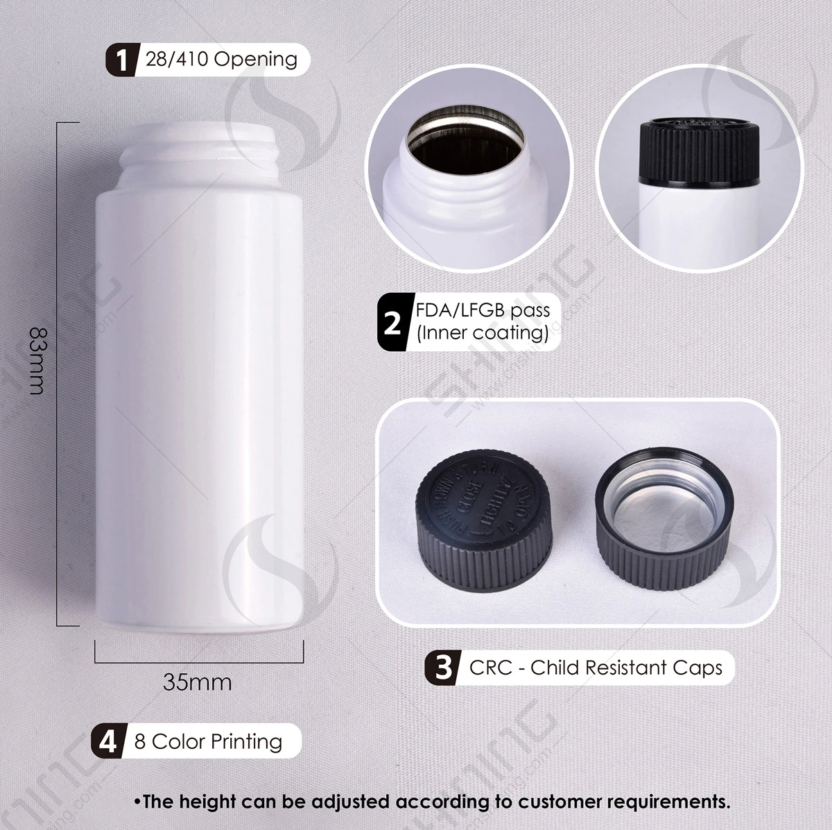 Выделитесь благодаря нашей опции 8-цветной печати, которая позволяет персонализировать контейнеры для таблеток в соответствии с вашим брендом или предпочтениями. Кроме того, высоту контейнеров можно регулировать в соответствии с вашими конкретными потребностями, обеспечивая индивидуальное решение для любых требований.