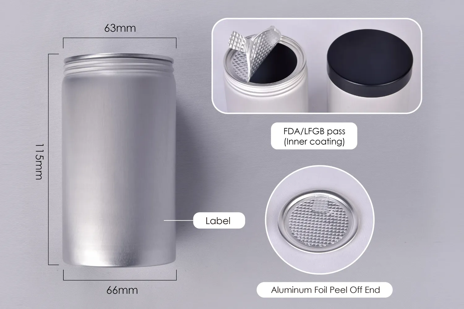Размеры: высота 115 мм, диаметр 66 мм, диаметр крышки 63 мм, что идеально подходит для упаковки и хранения.