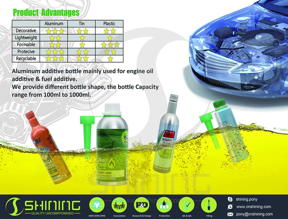 Алюминиевая бутылка главным образом uesd для присадки к моторному маслу и присадки к топливу.