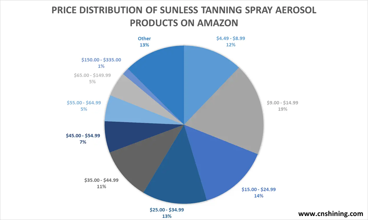 In analyzing the prices of Sunless Tanning Spray Aerosol products on Amazon, we see a diverse range of price points reflecting different product options. The majority of products fall into the $9.00 to $24.99 range, which makes up nearly 45% of the total listings. Specifically, the $9.00 – $14.99 range has the highest proportion at 18.45%, indicating a strong demand for budget-friendly options.