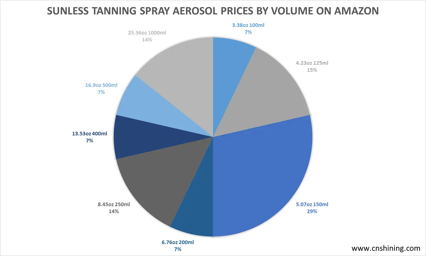 Upon analyzing the capacities of sunless tanning spray aerosol products available on Amazon, I observed some key trends and distribution patterns. The table provided shows different volume sizes and their respective percentages of the total product offerings.