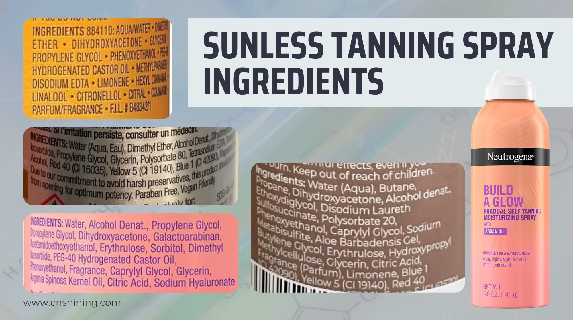 We researched several top-selling sunless tanning spray aerosol products on Amazon and identified the following common key ingredients: